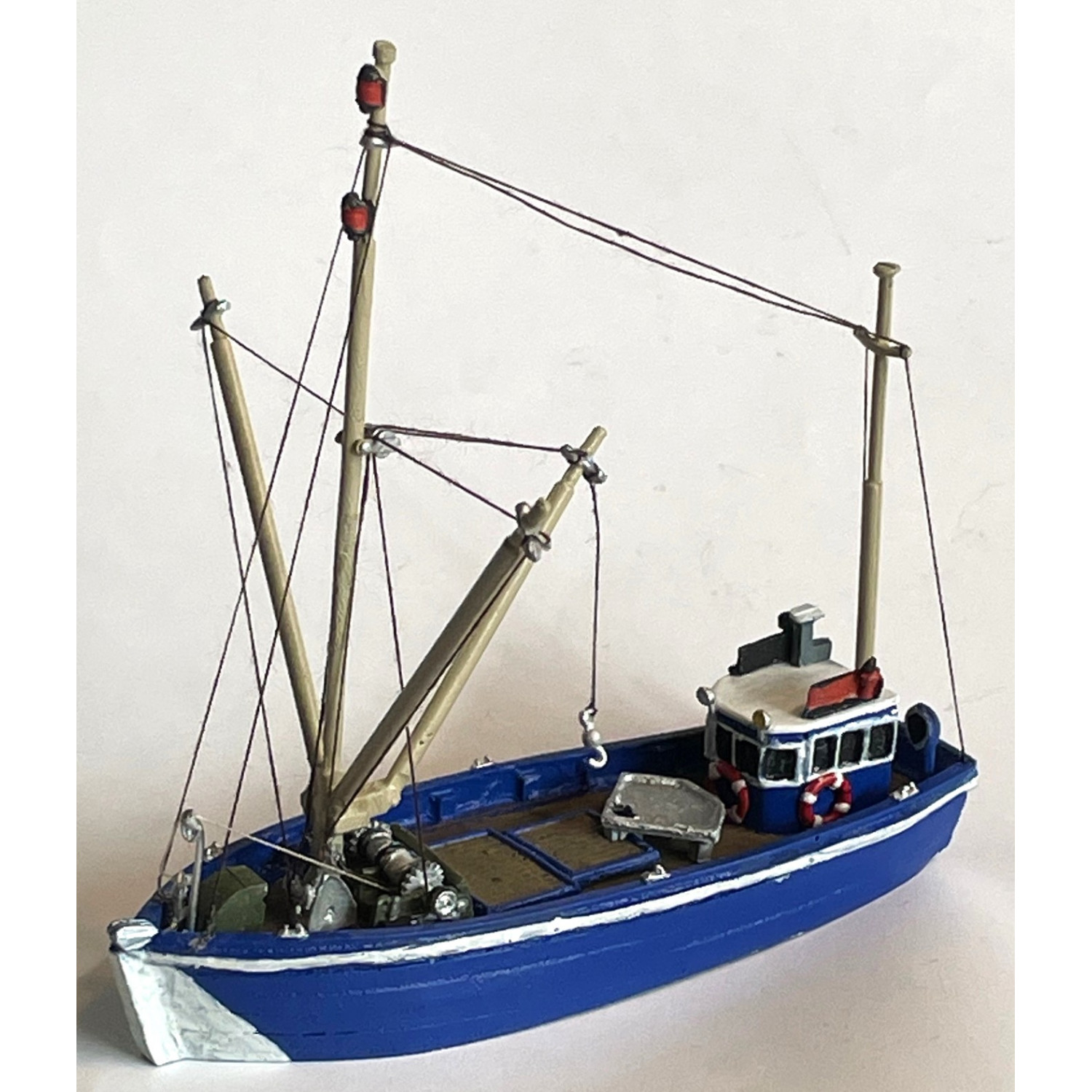 Vessel in made in resin (hull & Cabin) for ease of build and the accessories are white metal. The vessel has twin masts with loading crane and side riggers for twin net trawls.....hold and sorting bench, twin winch for derrek boom and to wind in/out twin booms, navigation lights, life rings, anchor anchor davit and sundry rope cletes, ventilation cowls and lights. Rigging thread included (pull through a candle as this flattens thread fibers 'fluff' so it does not attract dust in years to come)